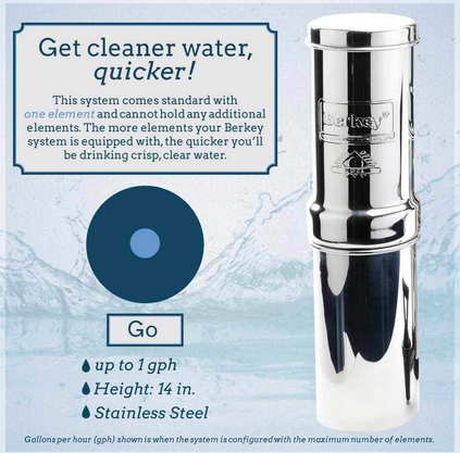 - Maximum Filtration Flow Rate: Configured with 1 Black Berkey Purification Element, the Go Berkey system can produce up to one gallon (3.8 liters) of purified drinking water per hour.